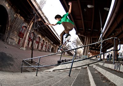 Nate Rojas claimed The Best Line In New York Clip Contest with a line shot by Harry Corrigan down at the Brooklyn Banks. Nate’s line features a bs 5050 down the small banks 9 stair, chain ollie into street, kickflips out of street, 360 flips down the big banks 4 stair and then seals the deal with a perfect crookiemonster down the big banks 13 stair. Nate walks away with $1,000, a year’s supply of Red Bull, one year’s supply of éS sneakers, $500 worth of Volcom gear and $500 worth of 5Boro gear… not bad for 42 seconds of skating!