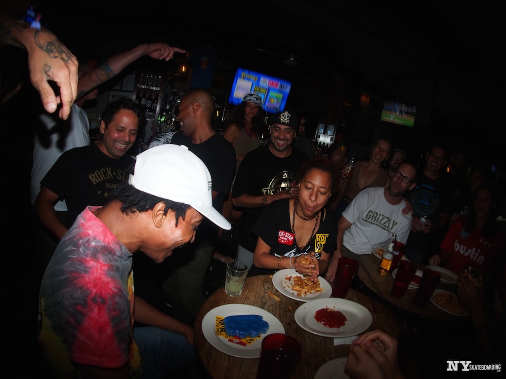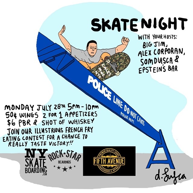 The July 28th Skate Night at Epstein’s Bar was sponsored by Rock Star and Fifth Avenue skateboards. Another french fry eating contest went down where the winner got a bunch of product. If you missed it we got a photo recap below.