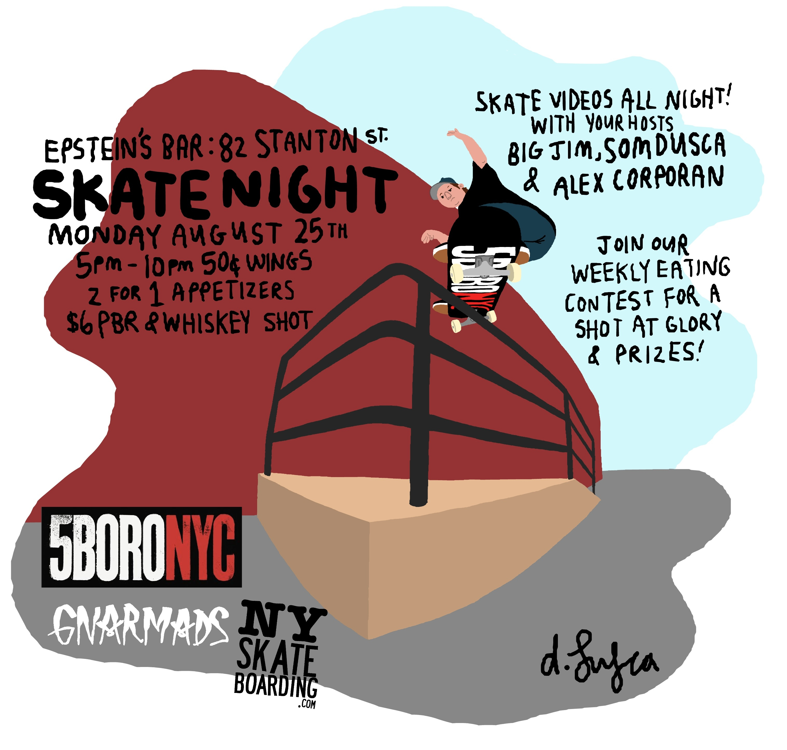 Last week’s Skate Night at Epstein’s Bar was sponsored by 5Boro. Heads had a chance to win some free product via a rice & beans eating contest. Another great NYC Summer night, check some photos below.