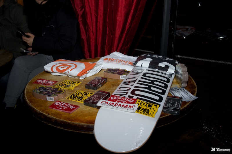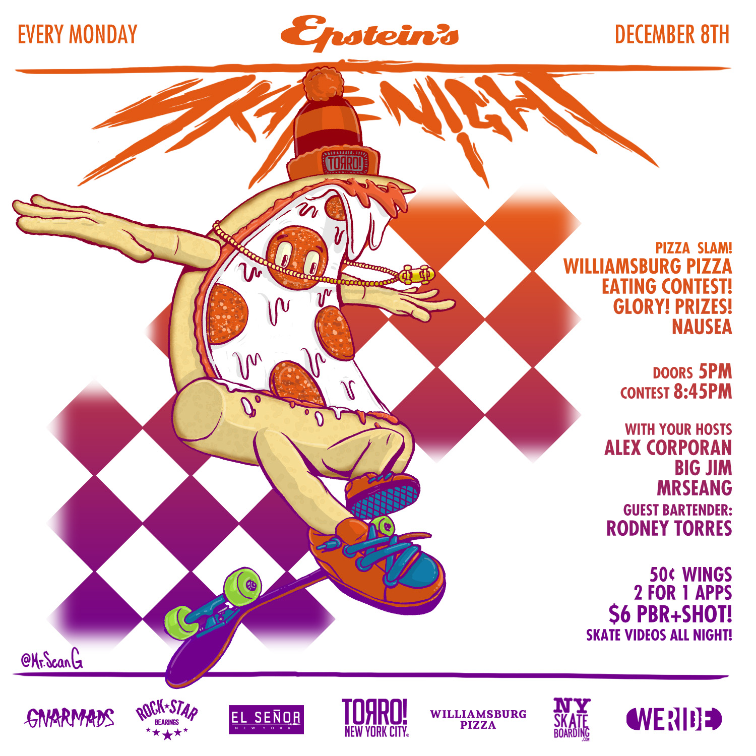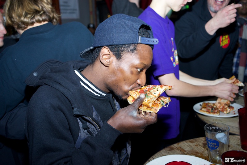 No need for an introduction to NYC’s weekly Skate Night at this point. Here’s some photos from last Monday (12/8) where Rodney Torres was the guest bartender, Williamsburg Pizza sponsored a pizza eating contest where winners went home with some TORRO! Skateboards product. Follow our event calendar for upcoming Skate Night details.