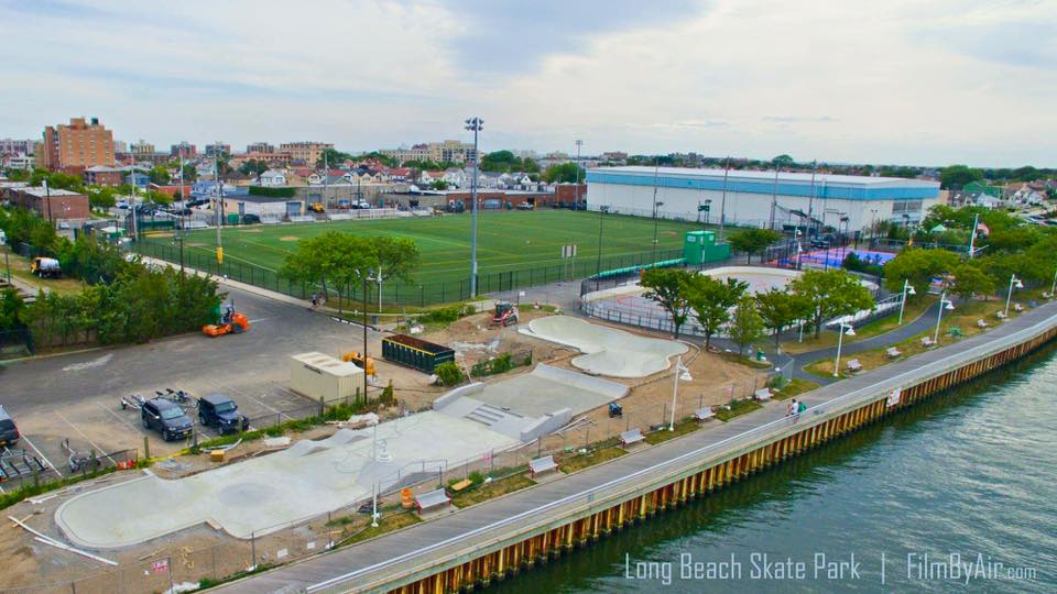 The new concrete skate park in Long Beach, NY is just about complete. They recently posted up an aerial shot of the actual park on The New Long Beach Skatepark Facebook page. Concrete is currently curing and should not be skated for a few weeks. Project is officially set to be completed by the end of Summer.