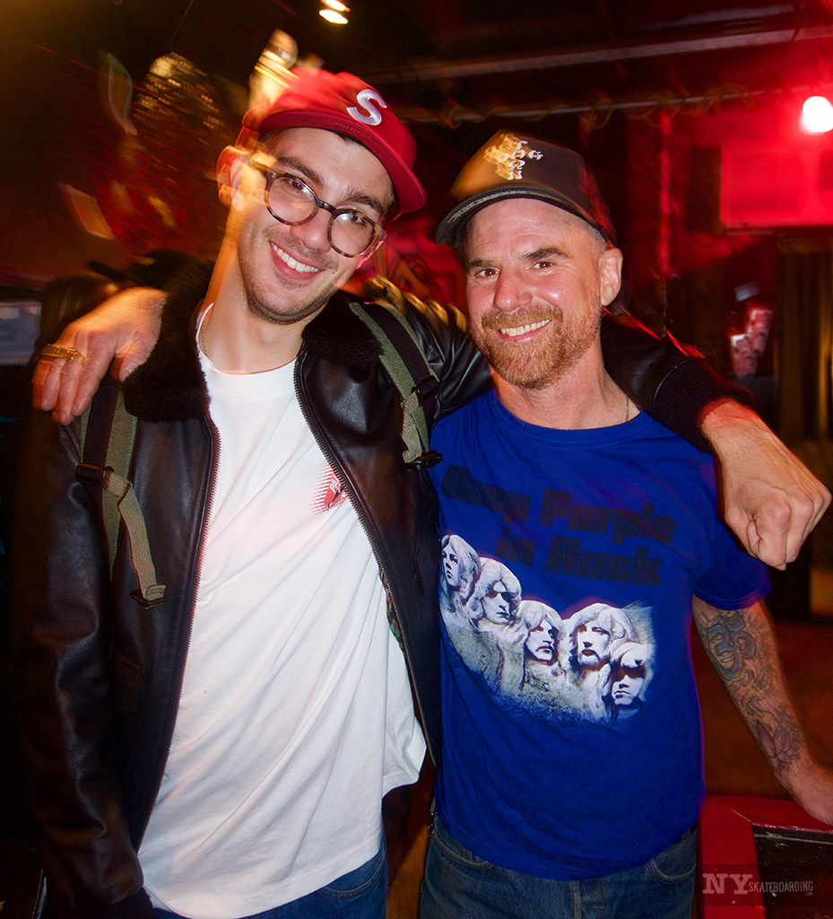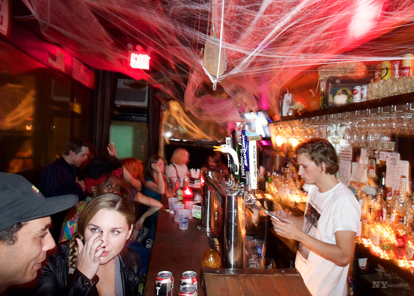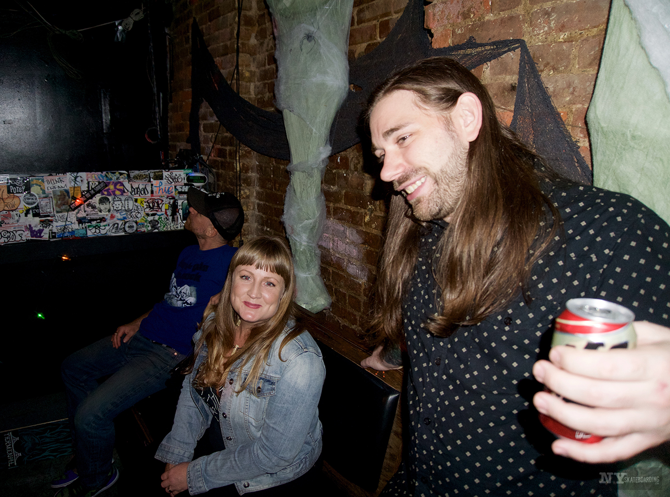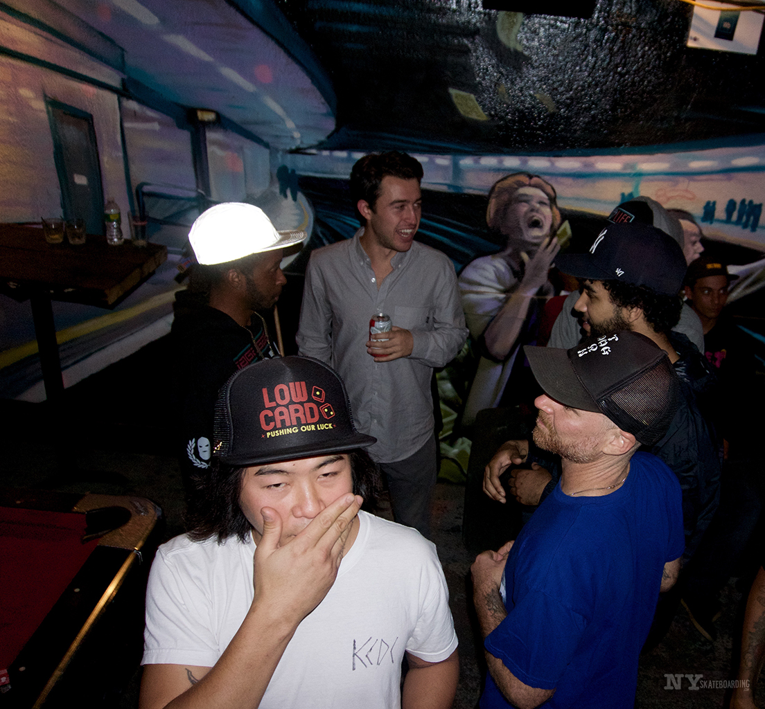 “Welcome to Skate Night!” echoes through the bar as Big Jim’s bellowing voice announces the return of a series of skateboard community events at Leftfield Bar in the Lower East Side. #SkateNightNYC is a bi-weekly event where we welcome all skaters that are of age (21+) to gather and hang together over some skate videos, billiards games, cheap drinks, good music & good vibes. By working with a variety of skate brands we offer raffle prizes as well as a food eating contest prizes, sponsored by a different local restaurant every time.