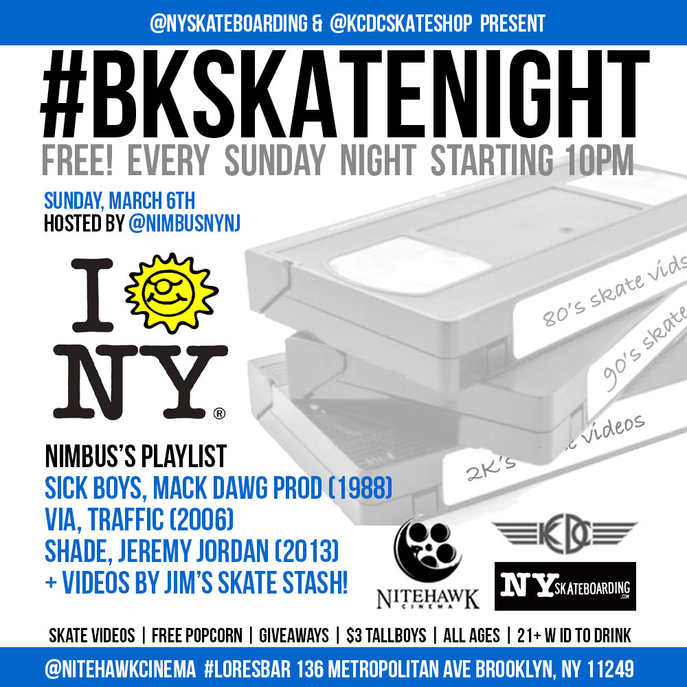 Tonight we’re bringing back #BKSKATENIGHT with special host/sponsor Nimbus Skateboards at Nitehawk Lo-Res Bar. Videos begin at 10pm.