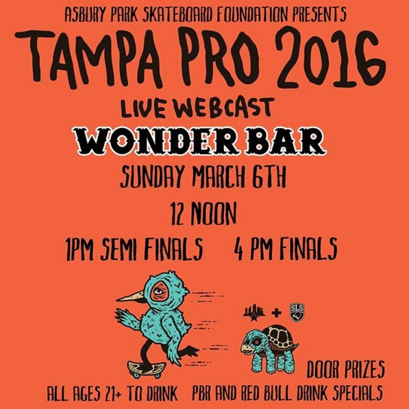 Today we’re heading over to Arlene’s Grocery at noon to watch the Tampa Pro live webcast and enjoy some drink specials served by Dom Susca.
