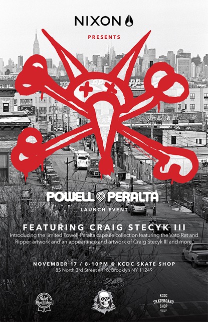 KCDC skate shop is celebrating 15 years tonight with some help from Nixon and Powell Peralta including special guest/OG skateboarding artist Craig Stecyk III. They will be introducing the limited Powell Peralta capsule collection featuring the Vato Rat and Ripper artwork. True skate history right here so come through and celebrate KCDC’s bday with some Pabst and artwork from a legend!